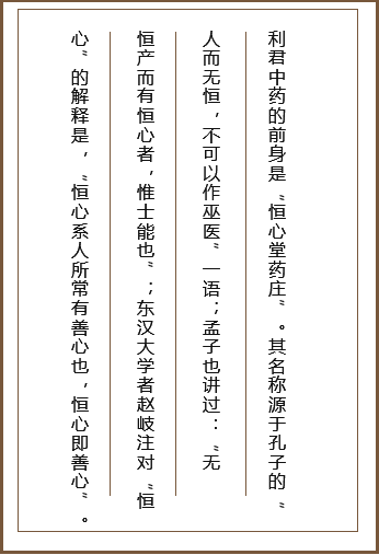 利君中藥具有近400年的悠久歷史。公司前身“恒心堂藥莊”始創(chuàng)于明朝末期,興盛于清代、民國,其招牌產(chǎn)品“坎壢妙濟 丹”、“參茸固本還少丹”功能獨特、療效神奇,享譽廣大西部地區(qū),有“神農(nóng)妙濟”之美譽,歷代名人左宗棠、于佑任、 屈武等都留有書聯(lián)贊譽。民國時期,“恒心堂”在西北5省及山西、四川、云南均設(shè)有分號,坐大西部藥界,同北京“同仁 堂”、浙江“胡慶余堂”、廣州“陳李記”一起,被稱為“四大藥莊”,是國內(nèi)為數(shù)不多的幾家具有數(shù)百年歷史的中藥“老 字號”之一。